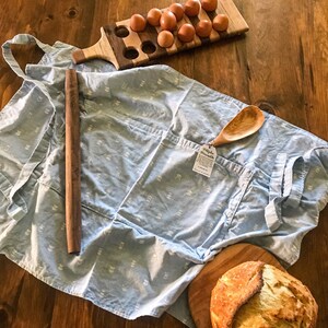 This half apron style is my favorite. It’s easy to wear and so comfortable. Plus it keeps the flour from getting all over you with the extra wide wrap cut!